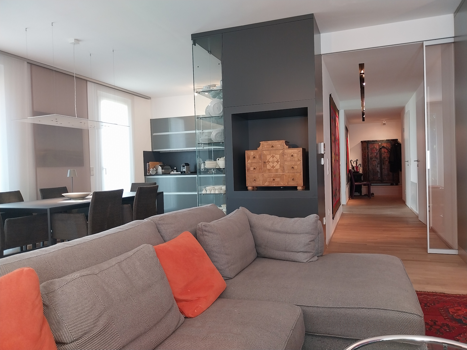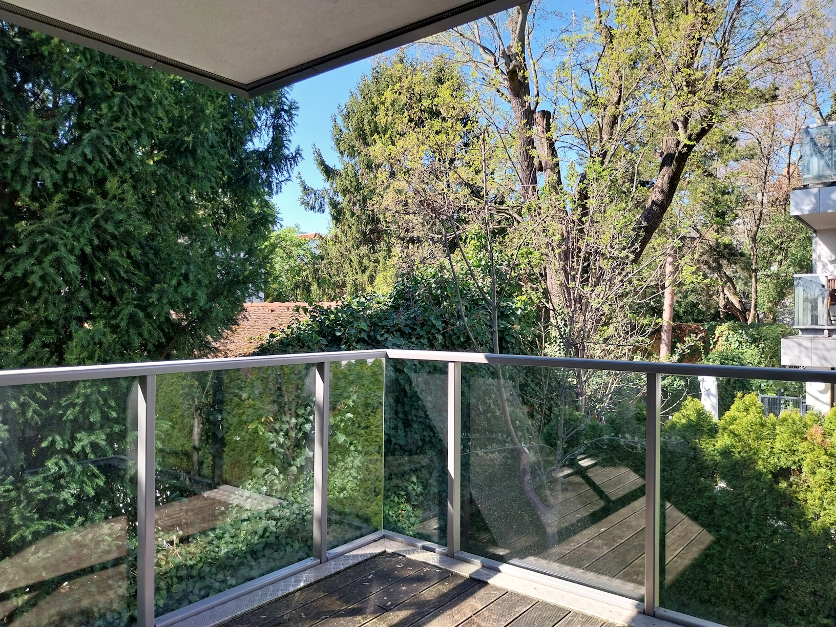 Die raumhohen Glasschiebetüren unterstreichen den großzügigen Charakter dieser Wohnung. Der komplette Wohnbereich wurde mit hochwertigen Eichenparkett ausgestattet, die Nassräume mit edlem Feinsteinzeug. Elektrische Außenjalousien lassen Sie auch im Sommer cool bleiben. Die Alarmanlage lässt Sie gut schlafen.
